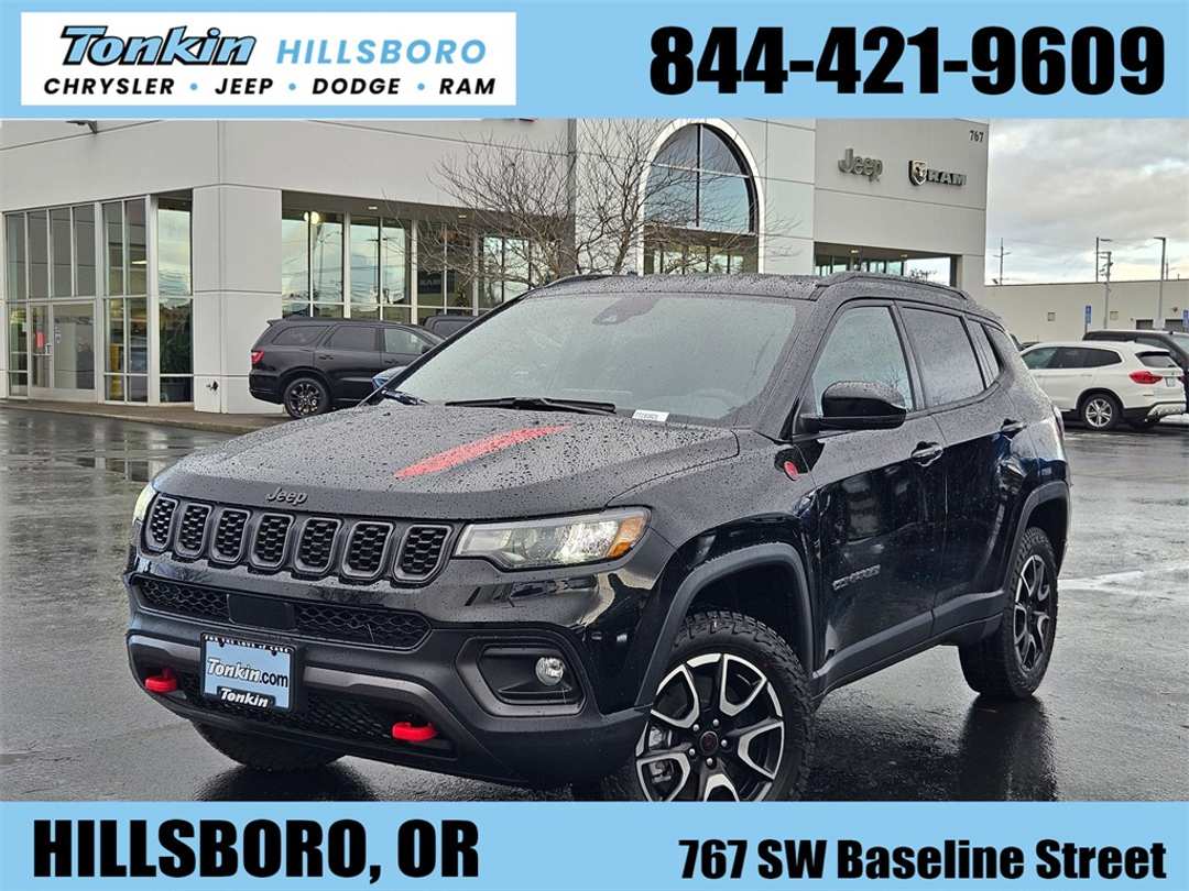 2026 Jeep Compass Trailhawk Diamond Black Crystal Pearlcoat 2.0L I4 DOHC 4WD 8-Speed Automatic4WD, 10.1" Touchscreen Display, 4-Wheel Disc Brakes, 4.398 Final Drive Ratio, 4G LTE Wi-Fi Hot Spot, 6 Speakers, ABS brakes, Air Conditioning, Alloy wheels, AM/FM radio: SiriusXM, Auto High-beam Headlights, Auto-dimming Rear-View mirror, Automatic temperature control, Brake assist, Bumpers: body-color, Compass, Delay-off headlights, Driver door bin, Driver vanity mirror, Dual front impact airbags, Dual front side impact airbags, Electronic Stability Control, Emergency communication system: SiriusXM Guardian, Four wheel independent suspension, Front anti-roll bar, Front Bucket Seats, Front Center Armrest w/Storage, Front dual zone A/C, Front fog lights, Front License Plate Bracket, Front reading lights, Fully automatic headlights, Global Telematics Box Module, Heated door mirrors, Heated front seats, Heated steering wheel, Illuminated entry, Knee airbag, Leather Shift Knob, Leather steering wheel, Low tire pressure warning, MyFlexCare Service Plan, Occupant sensing airbag, Outside temperature display, Overhead airbag, Overhead console, Panic alarm, ParkView Rear Back-Up Camera, Passenger door bin, Passenger vanity mirror, Power door mirrors, Power driver seat, Power Liftgate, Power steering, Power windows, Premium audio system: UConnect 5, Premium Cloth/Leather Trim Bucket Seats, Quick Order Package 29E, Radio: Uconnect 5 with 10.1" Display, Rain sensing wipers, Rear anti-roll bar, Rear seat center armrest, Rear window defroster, Rear window wiper, Remote keyless entry, Security system, SiriusXM Guardian - Included Trail (B), SiriusXM Radio Service, Speed control, Split folding rear seat, Spoiler, Steering wheel mounted audio controls, Tachometer, Telescoping steering wheel, Tilt steering wheel, Traction control, Trip computer, Turn signal indicator mirrors, Variably intermittent wipers, Wheels: 17" x 6.5" Painted Black Aluminum, 4WD. Price includes: $1000 - 2026 National Retail Bonus Cash . Exp. 03/02/2026