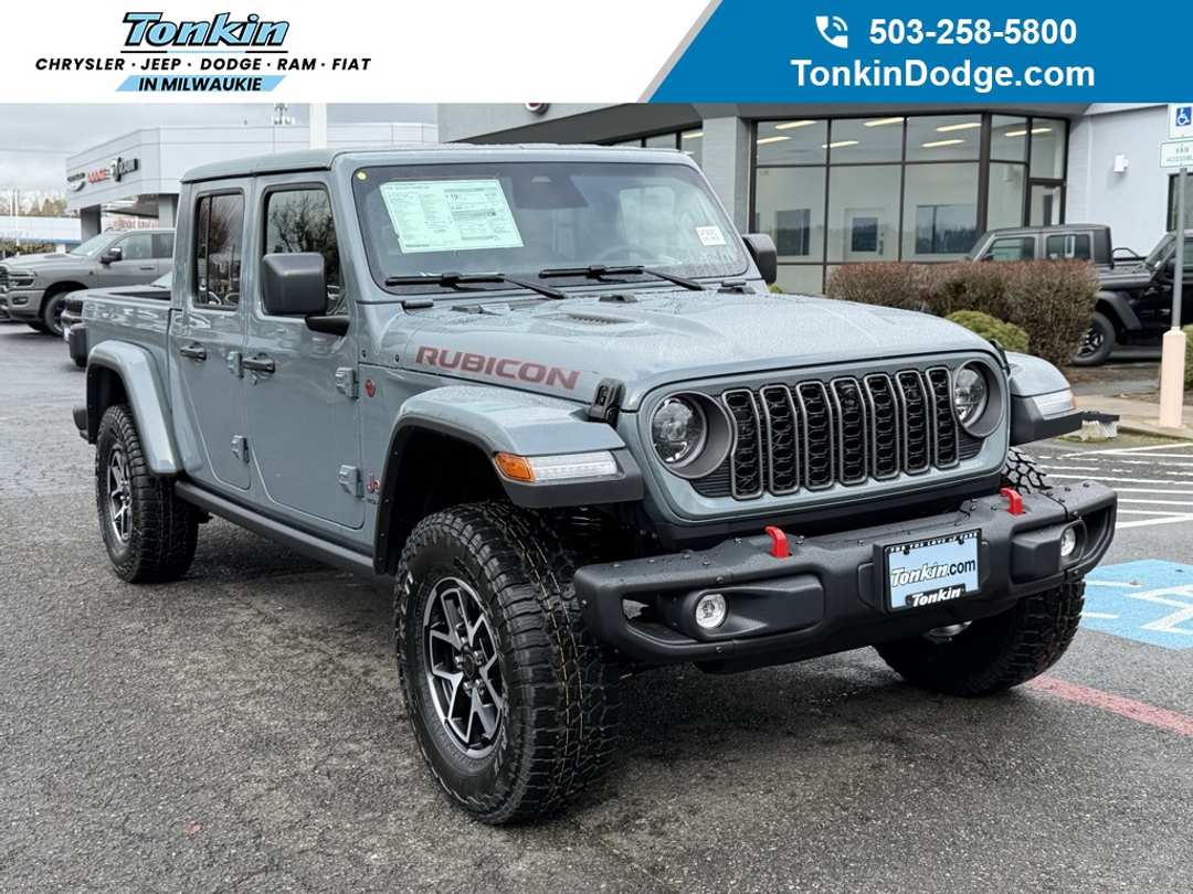 $4,043 off MSRP!2026 Jeep Gladiator Rubicon Anvil Clearcoat 110 Mph Vehicle Max Speed Calibration, 12.3" Touchscreen Display, 4-Wheel Disc Brakes, 4.10 Rear Axle Ratio, 4G LTE Wi-Fi Hot Spot, 8 Speakers, ABS brakes, Air Conditioning, Alexa Built-in, Alpine Premium Audio System, AM/FM radio: SiriusXM with 360L, Apple CarPlay, Apple CarPlay/Android Auto, Auto High Beam Headlamp Control, Auto-Dimming Rear-View Mirror, Automatic temperature control, Blind Spot and Cross Path Detection, Bluetooth Wireless Speaker, Body Color 3-Piece Hard Top, Body Color Rubicon Highline Flare, Brake assist, Cloth Low-Back Bucket Seats, Compass, Connectivity - US/Canada, Custom Fuel Wheels and Off-Road Tires, Delay-off headlights, Driver door bin, Driver vanity mirror, Dual front impact airbags, Dual front side impact airbags, Electronic Stability Control, Emergency communication system: Jeep Connect, For Details, Visit DriveUconnect.com, Freedom Panel Storage Bag, Front anti-roll bar, Front Bucket Seats, Front Center Armrest w/Storage, Front dual zone A/C, Front fog lights, Front License Plate Bracket, Front reading lights, Full Length Floor Console Premium Armrest, Fully automatic headlights, Google Android Auto, Heated door mirrors, Heated Front Seats, Heated Steering Wheel, Illuminated entry, Integrated Center Stack Radio, Integrated Off-Road Camera, Integrated roll-over protection, Integrated Voice Command with Bluetooth, Leather Wrapped Park Brake Handle, Leather Wrapped Shift Knob, Low tire pressure warning, MOPAR All-Weather Slush Mats, MOPAR Hardtop Headliner, MOPAR Spray in Bedliner, MyFlexCare Service Plan, Occupant sensing airbag, Outside temperature display, Overhead airbag, Panic alarm, ParkSense Rear Park Assist System, Passenger door bin, Passenger vanity mirror, Performance Suspension, Power 4-Way Driver Lumbar Adjust, Power 4-Way Passenger Lumbar Adjust, Power Adjust 8-Way Driver Seat, Power Adjust 8-Way Front Passenger Seat, Power Adjust Nappa Leather Seats, Power Dome Dual Vented Hood, Power door mirrors, Power steering, Power windows, Premium Door Trim Panel, Quick Order Package 24Y Rubicon X, Radio data system, Radio: Uconnect 5 Navigation with 12.3" Display, Radio: Uconnect 5 with 12.3" Display, Rear anti-roll bar, Rear Armrest with Cupholder Seat, Rear reading lights, Rear Sliding Window, Rear Window Defroster, Remote keyless entry, Rubicon Hood Top Decal, Security system, SiriusXM Radio Service, SiriusXM with 360L, Speed control, Split folding rear seat, Steel Front Bumper, Steel Power Dome Hood Package, Steering wheel mounted audio controls, Tachometer, Telescoping steering wheel, Tilt steering wheel, Traction control, Trip computer, Universal Garage Door Opener, USB Host Flip, Variably intermittent wipers, Voltmeter, Wheels: 17" x 7.5" Machined/Painted Black.