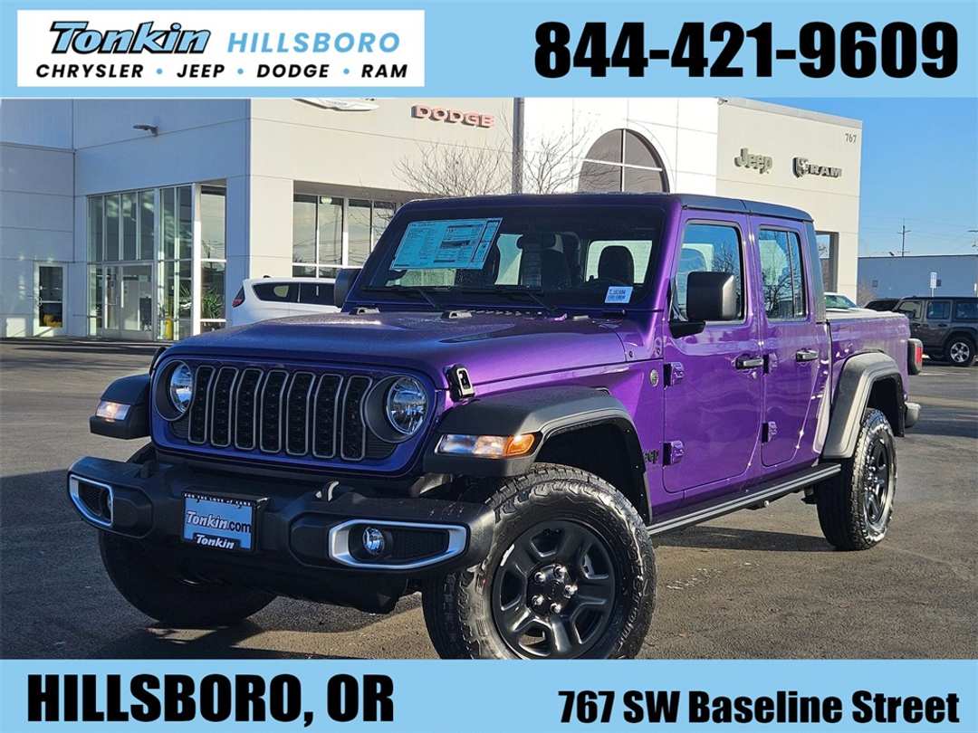 2026 Jeep Gladiator Sport reign 3.6L V6 24V VVT 4WD 8-Speed Automatic110 Mph Vehicle Max Speed Calibration, 12.3" Touchscreen Display, 4-Wheel Disc Brakes, 4G LTE Wi-Fi Hot Spot, 8 Speakers, ABS brakes, Air Conditioning, Alexa Built-in, AM/FM radio: SiriusXM with 360L, Anti-Spin Differential Rear Axle, Apple CarPlay, Apple CarPlay/Android Auto, Black 3-Piece Hard Top, Black Molded-in-Color Fender Flares (2-Piece), Brake assist, Class IV Receiver Hitch, Compass, Connectivity - US/Canada, Conventional Differential Front Axle, Dana M210 Wide Front Axle, Dana M220 Wide Rear Axle, Daytime Running Lamp System, Delay-off headlights, Driver door bin, Driver vanity mirror, Dual front impact airbags, Dual front side impact airbags, Electronic Stability Control, Freedom Panel Storage Bag, Front anti-roll bar, Front Bucket Seats, Front Center Armrest w/Storage, Front fog lights, Front License Plate Bracket, Front reading lights, Google Android Auto, Heavy-Duty Engine Cooling, Illuminated entry, Integrated roll-over protection, Low tire pressure warning, Max Tow Package with 4.10 Axle Ratio, MOPAR Hard Tri-Fold Tonneau Cover, MOPAR Spray in Bedliner, MyFlexCare Service Plan, Normal Duty Suspension, Occupant sensing airbag, Outside temperature display, Overhead airbag, Panic alarm, ParkView Rear Back-Up Camera, Passenger door bin, Passenger vanity mirror, Power steering, Power windows, Quick Order Package 24B Sport, Radio data system, Radio: Uconnect 5 with 12.3" Display, Rear anti-roll bar, Rear reading lights, Rear Sliding Window, Rear Window Defroster, Remote keyless entry, Speed control, Split folding rear seat, Steering wheel mounted audio controls, Tachometer, Telescoping steering wheel, Tilt steering wheel, Traction control, Trip computer, USB Host Flip, Variably intermittent wipers, Voltmeter, Wheels: 17" x 7.5" Black Steel Styled. Price includes: $1000 - 2026 West BC Retail Bonus Cash . Exp. 03/02/2026
