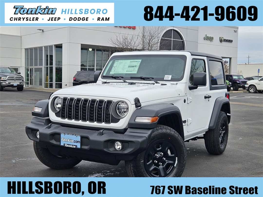 2026 Jeep Wrangler Sport Bright White Clearcoat 2.0L I4 DOHC 4WD 8-Speed Automatic12.3" Touchscreen Display, 3.45 Overall Top Gear Ratio, 4-Wheel Disc Brakes, 4G LTE Wi-Fi Hot Spot, 8 Speakers, ABS brakes, Air Conditioning, AM/FM radio: SiriusXM with 360L, Apple CarPlay, Apple CarPlay/Android Auto, Aux Battery, Black 3-Piece Hard Top, Brake assist, Cloth Low-Back Bucket Seats, Compass, Connectivity - US/Canada, Deep Tint Sunscreen Windows, Delay-off headlights, Driver door bin, Driver vanity mirror, Dual front impact airbags, Dual front side impact airbags, Electronic Stability Control, For More Info, Call 800-643-2112, Freedom Panel Storage Bag, Front anti-roll bar, Front Bucket Seats, Front Center Armrest w/Storage, Front fog lights, Front reading lights, Google Android Auto, Illuminated entry, Integrated Center Stack Radio, Integrated roll-over protection, Low tire pressure warning, Myflexcare Service Plan, Non-Lock Fuel Cap Without Discriminator, Normal Duty Suspension, Occupant sensing airbag, Outside temperature display, Overhead airbag, Panic alarm, ParkView Rear Back-Up Camera, Passenger door bin, Passenger vanity mirror, Power steering, Power windows, Quick Order Package 22B Sport, Radio data system, Radio: Uconnect 5 with 12.3" Display, Rear anti-roll bar, Rear reading lights, Rear Window Defroster, Rear Window Wiper/Washer, Remote keyless entry, SiriusXM Radio Service, SiriusXM with 360L, Speed control, Steering wheel mounted audio controls, Stop-Start Dual Battery System, Tachometer, Telescoping steering wheel, Tilt steering wheel, Traction control, Trip computer, Variably intermittent wipers, Wheels: 17" x 7.5" Black Steel Styled. Price includes: $1000 - 2026 National Select Inventory Bonus Cash . Exp. 01/04/2027