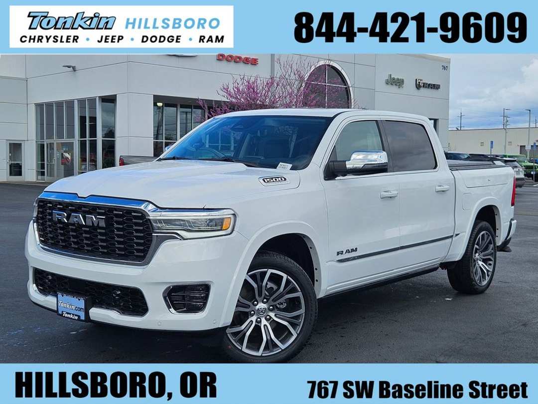 2026 Ram 1500 Tungsten Bright White Clearcoat 3.0L I6 4WD 8-Speed Automatic12-Way/1-Way Trailer Connector, 3.92 Rear Axle Ratio, 4-Wheel Disc Brakes, ABS brakes, Adjustable pedals, Air Conditioning, Alloy wheels, AM/FM radio, Apple CarPlay/Android Auto, Audio memory, Auto High-beam Headlights, Auto Power-Folding Mirrors, Auto-dimming door mirrors, Auto-Dimming Exterior Driver Mirror, Auto-dimming Rear-View mirror, Auto-leveling suspension, Automatic temperature control, Bed Utility Group, Bodyside moldings, Brake assist, Bumpers: body-color, Chrome Exterior Mirrors, Compass, Delay-off headlights, Driver door bin, Driver vanity mirror, Dual front impact airbags, Dual front side impact airbags, Electronic Stability Control, Exterior 115V AC Outlet, Exterior Mirrors Courtesy Lamps, Exterior Mirrors with Heating Element, Exterior Mirrors with Memory, Exterior Mirrors with Supplemental Signals, Exterior Parking Camera Rear, Front anti-roll bar, Front Bucket Seats, Front Center Armrest w/Storage, Front dual zone A/C, Front fog lights, Front License Plate Bracket, Front reading lights, Front wheel independent suspension, Fully automatic headlights, Garage door transmitter, Heads-Up Display, Heated door mirrors, Heated front seats, Heated rear seats, Heated steering wheel, Illuminated entry, Leather steering wheel, Low tire pressure warning, Memory seat, MOPAR 4 Adjustable Cargo Tie-Down Hooks, MyFlexCare Service Plan, Navigation System, Occupant sensing airbag, Outside temperature display, Overhead airbag, Overhead console, Panic alarm, Passenger door bin, Passenger vanity mirror, Pedal memory, Power adjustable front head restraints, Power door mirrors, Power driver seat, Power moonroof, Power passenger seat, Power steering, Power windows, Premium Leather Bucket Seats, Quick Order Package 22V Tungsten, Radio data system, Radio: Uconnect 5 Nav with 14.4" Display, Rain sensing wipers, Rear anti-roll bar, Rear reading lights, Rear seat center armrest, Rear step bumper, Rear window defroster, Remote keyless entry, Security system, Speed control, Split folding rear seat, Steering wheel mounted audio controls, Tachometer, Telescoping steering wheel, Tilt steering wheel, Traction control, Trailer Brake Control, Trailer Light Check, Trailer Reverse Steering Control, Trailer Tire Pressure Monitoring System, Trailer Tow Group, Trip computer, Truck Bed Cargo Divider, Turn signal indicator mirrors, Variably intermittent wipers, Ventilated front seats, Ventilated rear seats, Voltmeter, Wheels: 22" x 9" Polish/Painted with Inserts.