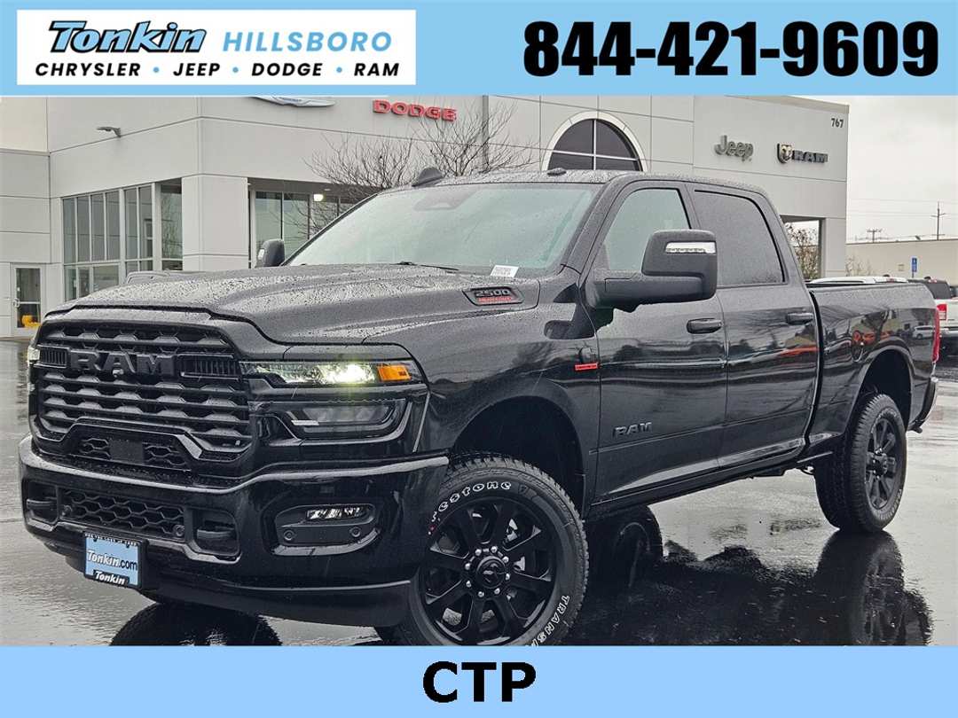2026 Ram 2500 Big Horn Diamond Black Crystal Pearlcoat 6.7L I6 4WD 8-Speed Automatic115-Volt Auxiliary Front Power Outlet, 115V Auxiliary Rear Power Outlet, 12" Touchscreen Display, 2 Way Rear Headrest Seat, 2nd Row in Floor Storage Bins, 4 Way Front Headrests, 4-Wheel Disc Brakes, 40/20/40 Split Bench Seat, 400W Inverter, 4G LTE Wi-Fi Hot Spot, 6 Speakers, 9 Alpine Speakers with Subwoofer, ABS brakes, Active Lane Management System, Adaptive Steering System, Air Conditioning, Air Conditioning ATC with Dual Zone Control, Alexa Built-in, Alloy wheels, AM/FM radio: SiriusXM, Anti-Spin Differential Rear Axle, Apple CarPlay, Apple CarPlay/Android Auto, Auto High Beam Headlamp Control, Auto Power-Folding Mirrors, Auto-Dimming Rear-View Mirror, Big Horn Level 2 Plus Equipment Group, Black Exterior Mirrors, Black Exterior Truck Badging, Black Interior Accents, Black Wheel Center Hub, Blind Spot and Cross Path Detection, Body Color Grille-Surround, Brake assist, Bucket Seats, Bumpers: chrome, Center Hub, Center Stop Lamp with Cargo View Camera, Cloth 40/20/40 Bench Seat, Cluster 7.0" TFT Color Display, Compass, Connected Travel and Traffic Services, Connectivity - US/Canada, Dampened Tailgate, Delay-off headlights, Disassociated Touchscreen Display, Driver door bin, Drowsy Driver Detection, Dual front impact airbags, Dual front side impact airbags, Dual Glove Boxes, Dual Wireless Charging Pad, Electronic Stability Control, Emergency Vehicle Alert System (EVAS), Exterior 115V AC Outlet, Exterior Mirrors Courtesy Lamps, Exterior Mirrors with Heating Element, Exterior Mirrors with Supplemental Signals, Foam Bottle Insert (door Trim Panel), Folding Flat Load Floor Storage, Footwell Courtesy Lamp, For Details, Visit DriveUconnect.com, For More Info, Call 800-643-2112, Forward and Reverse Utility Lights, Front anti-roll bar, Front Armrest with Cupholders, Front Center Armrest w/Storage, Front fog lights, Front License Plate Bracket, Front reading lights, Front Seat Back Map Pockets, Full Length Upgraded Floor Console, Fully automatic headlights, Global Telematics Box Module, Gloss Black Nostrils/Mic Black Grille, Glove Box Lamp, Google Android Auto, GPS Antenna Input, GPS Navigation, HD Radio, Heated door mirrors, Heated Front Seats, Heated Steering Wheel, Illuminated entry, Integrated Voice Command with Bluetooth, LED Bed Lighting, LED Tail Lamps, Locking Lower Glove Box, Low tire pressure warning, Luxury Steering Wheel, Manual Adjust 4-Way Driver Seat, Manual Adjust 4-Way Front Passenger Seat, Media Hub with 2 Charge Only USBs, Mirror Running Lights, MOPAR Deployable Bed Step, MOPAR Spray in Bedliner, MyFlexCare Service Diesel, Night Edition, Occupant sensing airbag, Off-Road Info Pages, Outside temperature display, Overhead airbag, Overhead console, Painted Front Bumper, Painted Rear Bumper, Panic alarm, ParkView Rear Back-Up Camera, Passenger door bin, Passenger vanity mirror, Power 2-Way Driver Lumbar Adjust, Power Adjust 8-Way Driver Seat, Power Adjust Mirrors, Power Adjustable Pedals, Power door mirrors, Power Heated Folding Telescopic Mirrors, Power steering, Power Telescoping Mirrors, Power windows, Power-Adjustable Convex Aux Mirrors, Premium Cloth Bucket Seats, Quick Order Package 24Z Big Horn, Radio data system, Radio: Uconnect 5 Navigation with 12.0" Display, Radio: Uconnect 5 with 8.4" Display, Rain Sensitive Windshield Wipers, Rear 60/40 Folding Seat, Rear anti-roll bar, Rear Dome with on/Off Switch Lamp, Rear Folding Seat, Rear Power Sliding Window, Rear seat center armrest, Rear step bumper, Rear window defroster, Red Tail Lamp Bezels, Remote keyless entry, Remote Start System, Remote USB Port - Charge Only, Security system, Selectable Tire Fill Alert, SiriusXM Radio Service, SiriusXM with 360L, Speed control, Steering Wheel Mounted Audio Controls, Storage Tray, Sun Visors with Illuminated Vanity Mirrors, Surround View Camera System, Tachometer, Tilt steering wheel, Traction control, Traffic Sign Recognition, Trailer R