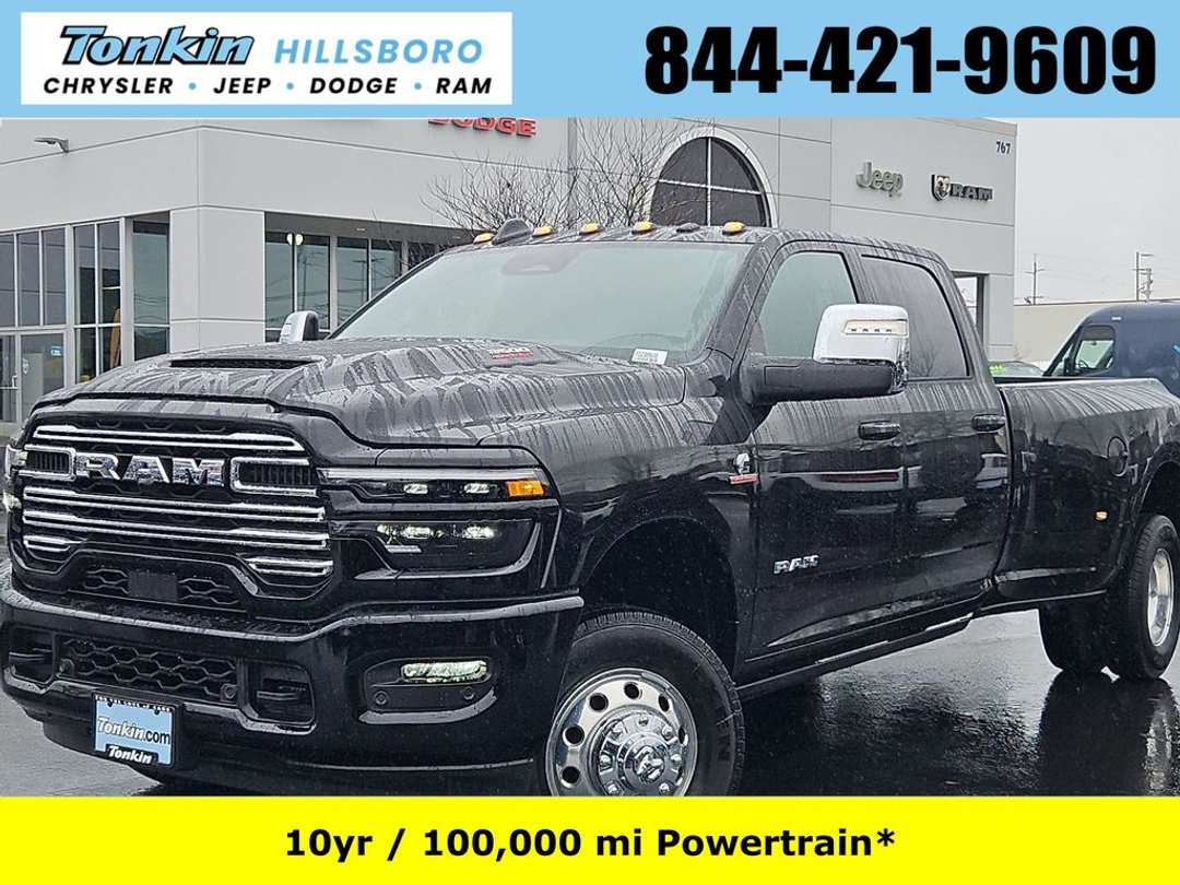 2026 Ram 3500 Laramie Diamond Black Crystal Pearlcoat 6.7L I6 4WD 8-Speed Automatic#1 Seat Foam Cushion, 10 Speakers, 115V Auxiliary Rear Power Outlet, 14.4" Touchscreen Display, 17 Speaker Harman/Kardon Premium Sound, 2 Way Rear Headrest Seat, 2nd Row in Floor Storage Bins, 4 Way Front Headrests, 4-Wheel Disc Brakes, 4G LTE Wi-Fi Hot Spot, 50 Gallon Fuel Tank, 5th Wheel/Gooseneck Towing Prep Group, 6000# Front Axle with Hub Extension, ABS brakes, Active Lane Management System, Adaptive Steering System, Air Conditioning, Alexa Built-in, Alloy wheels, AM/FM radio: SiriusXM with 360L, Apple CarPlay, Apple CarPlay/Android Auto, Auto Adjust in Reverse Exterior Mirrors, Auto Dimming Exterior Passenger Mirror, Auto High Beam Headlamp Control, Auto Level Rear Air Suspension, Auto Power-Folding Mirrors, Auto-Dimming Exterior Mirrors, Auto-dimming Rear-View mirror, Automatic temperature control, Black Wheel Center Hub, Body Color Grille Surround, Box and Rear Fender Clearance Lamps, Brake assist, Bucket Seats, Bumpers: body-color, Center Hub, Center Stop Lamp with Cargo View Camera, Chrome Exterior Mirrors, Clearance Lamps, Compass, Connected Travel and Traffic Services, Connectivity - US/Canada, Delay-off headlights, Disassociated Touchscreen Display, Driver door bin, Driver vanity mirror, Drowsy Driver Detection, Dual front impact airbags, Dual front side impact airbags, Dual Rear Wheels, Dual Wireless Charging Pad, Electronic Stability Control, Emergency Vehicle Alert System (EVAS), Exterior Mirrors Courtesy Lamps, Exterior Mirrors with Heating Element, Exterior Mirrors with Memory, Exterior Mirrors with Supplemental Signals, Foam Bottle Insert (door Trim Panel), Folding Flat Load Floor Storage, For Details Visit DriveUconnect.com, For More Info, Call 800-643-2112, Forward and Reverse Utility Lights, Front anti-roll bar, Front Center Armrest w/Storage, Front dual zone A/C, Front fog lights, Front License Plate Bracket, Front reading lights, Front Seat Back Map Pockets, Full Length Upgraded Floor Console, Fully automatic headlights, Garage door transmitter, Global Telematics Box Module, Google Android Auto, GPS Antenna Input, GPS Navigation, HD Radio, Heated door mirrors, Heated Front Seats, Heated front seats, Heated Steering Wheel, Heated steering wheel, High Back Seats, Illuminated entry, Integrated Voice Command with Bluetooth, Laramie Level 2 Plus Equipment Group, Leather Trim 40/20/40 Bench Seat, Leather Trimmed Bucket Seats, LED Bed Lighting, Low tire pressure warning, Max Tow Package, Mirror Running Lights, MOPAR Deployable Bed Step, MOPAR Front and Rear Rubber Floor Mats, MOPAR Spray in Bedliner, MyFlexCare Service Diesel, Navigation System, Nexen Brand Tires, Occupant sensing airbag, Off-Road Information Pages, Outside temperature display, Overhead airbag, Overhead console, Panic alarm, ParkView Rear Back-Up Camera, Passenger door bin, Passenger vanity mirror, Power 2-Way Driver Lumbar Adjust, Power 2-Way Passenger Lumbar Adjust, Power Adjust 8-Way Driver Seat, Power Adjust 8-Way Front Passenger Seat, Power Adjust Mirrors, Power Adjustable Pedals with Memory, Power Deployable Running Boards, Power door mirrors, Power driver seat, Power Heat Fold Memory Telescopic Mirrors, Power passenger seat, Power steering, Power Sunroof, Power Telescoping Mirrors, Power windows, Power-Adjustable Convex Aux Mirrors, Quick Order Package 24H Laramie, Radio data system, Radio: Uconnect 5 Nav with 14.4" Display, Radio: Uconnect 5 Navigation with 12.0" Display, Rain Sensitive Windshield Wipers, Rear 60/40 Folding Seat, Rear reading lights, Rear seat center armrest, Rear step bumper, Rear window defroster, Remote keyless entry, Remote Tailgate Release, Security system, Selectable Tire Fill Alert, SiriusXM Radio Service, SiriusXM with 360L, Speed control, Split folding rear seat, Sport Appearance Package, Sport Decal, Sport Performance Hood, Steering wheel mounted audio cont Price includes: $1000 - 2026 National Bonus Cash . Exp. 04/30/2026